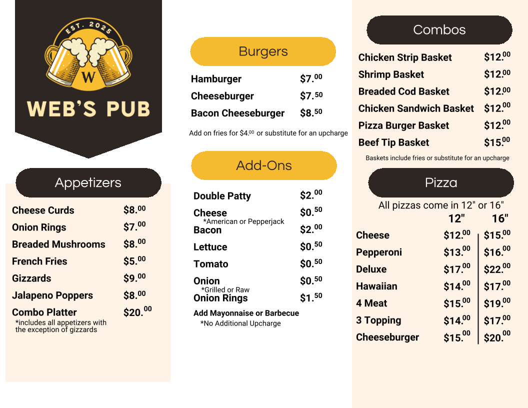 Further enriching the experience is their creative range of add-ons including juicy double patties, melted cheese, and crispy bacon, which elevate any dish from ordinary to extraordinary. The affordability of options paired with quality is a cornerstone of Web's Pub, making it a favored destination among locals and travelers alike.